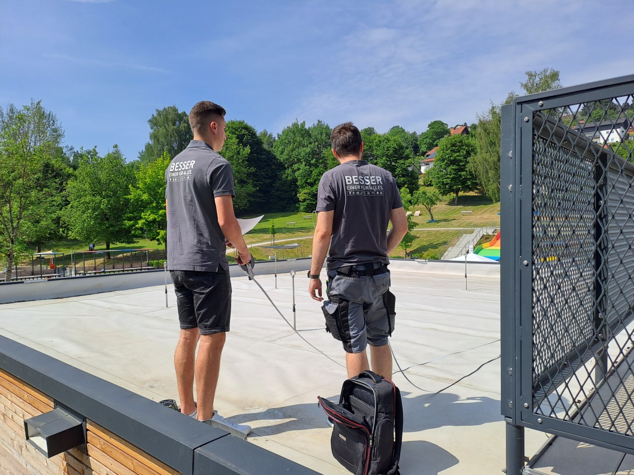 Von der Firma Praml aus Ruderting, beauftragt für die Installation der PV-Anlage, wurde das Flachdach vermessen. Anschließend besichtigten die Experten noch den Technikraum, u.a. um die Verkabelung zwischen PV-Anlage und Ladesäule sicherzustellen.